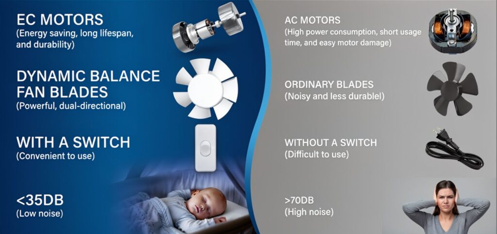 • Gelişmiş EC motor teknolojisi: Daha yüksek enerji verimliliği ve daha uzun ömür ile geleneksel AC motorlardan daha iyi performans gösterir. Sık sık değişimlere veda edin.